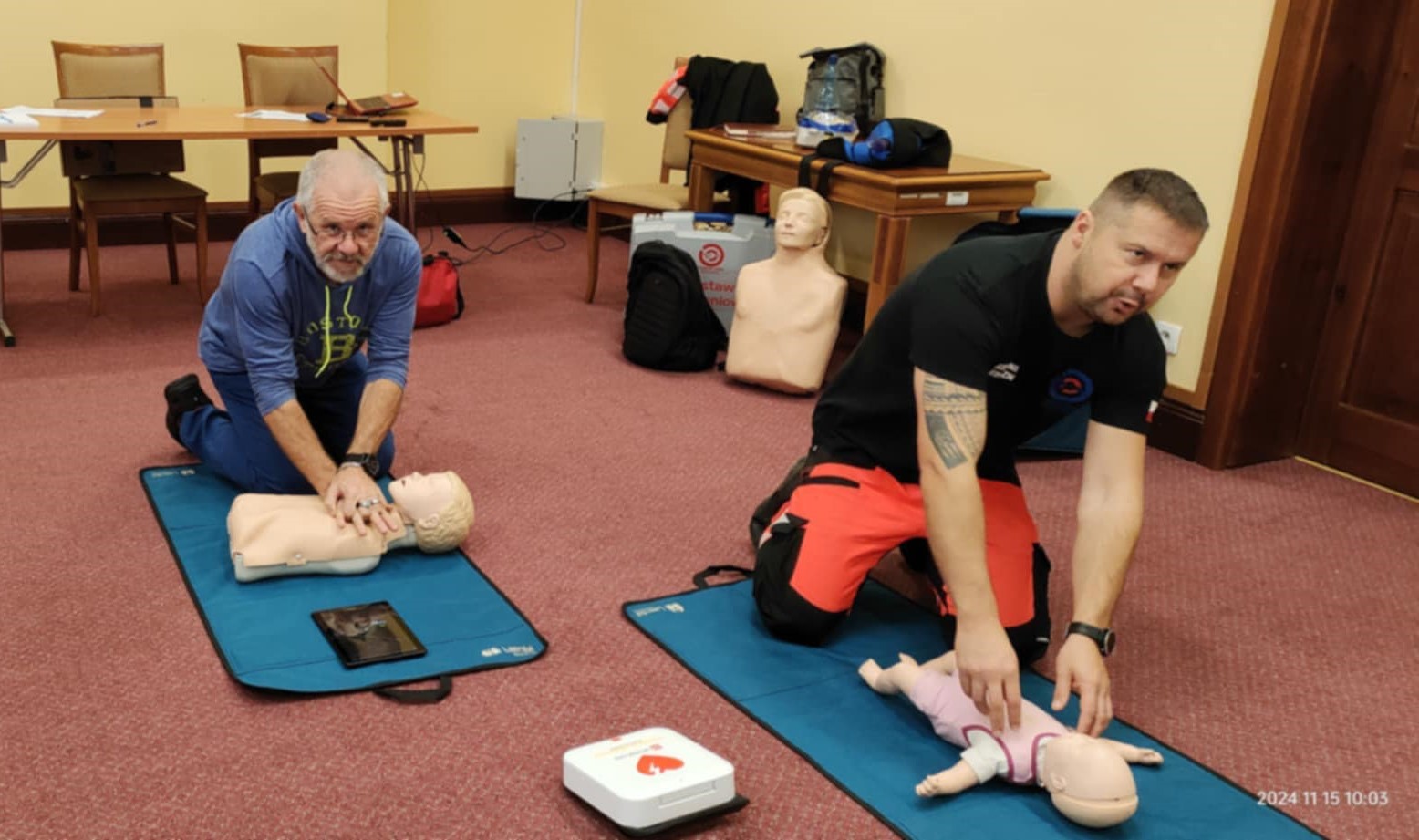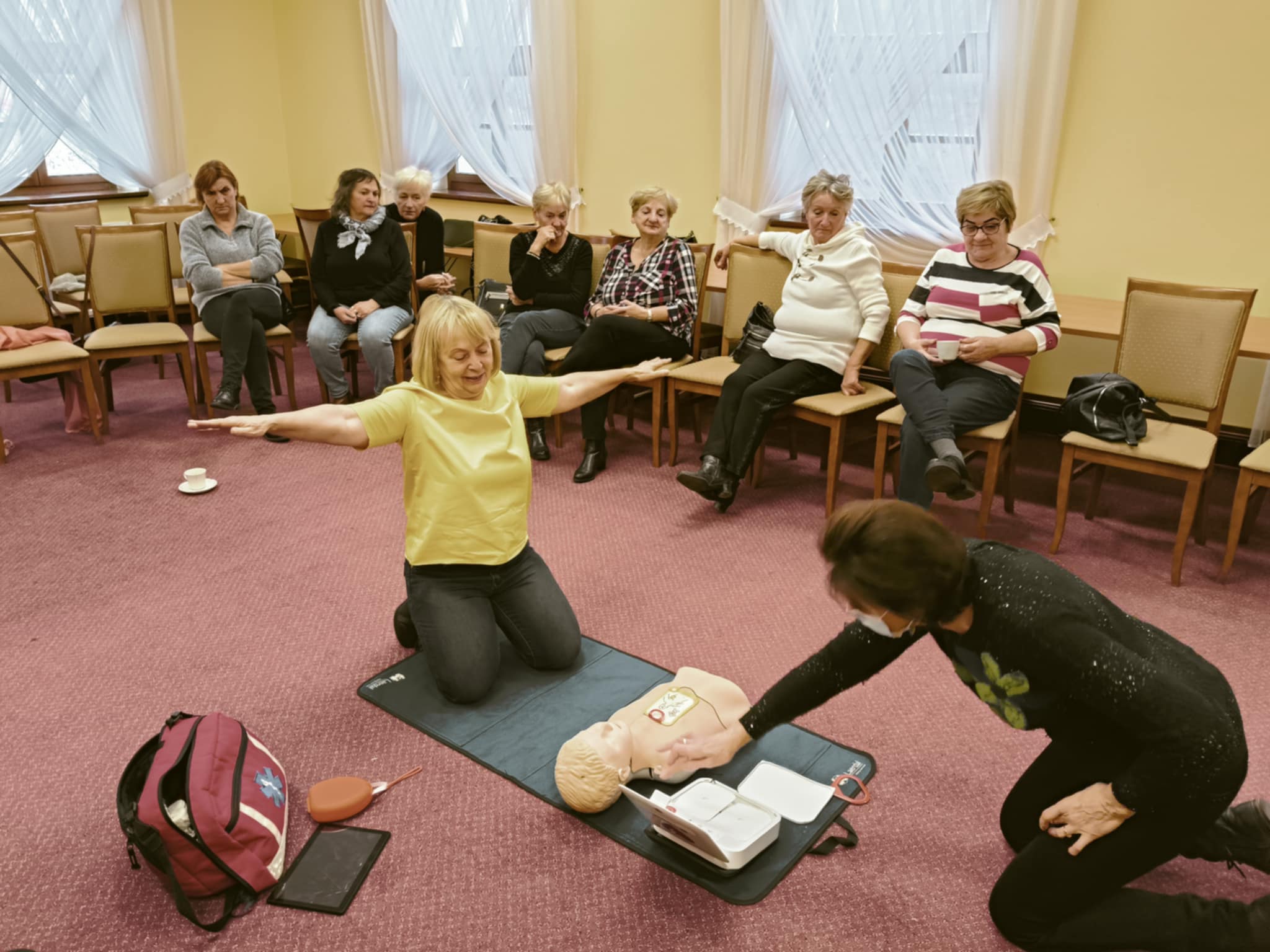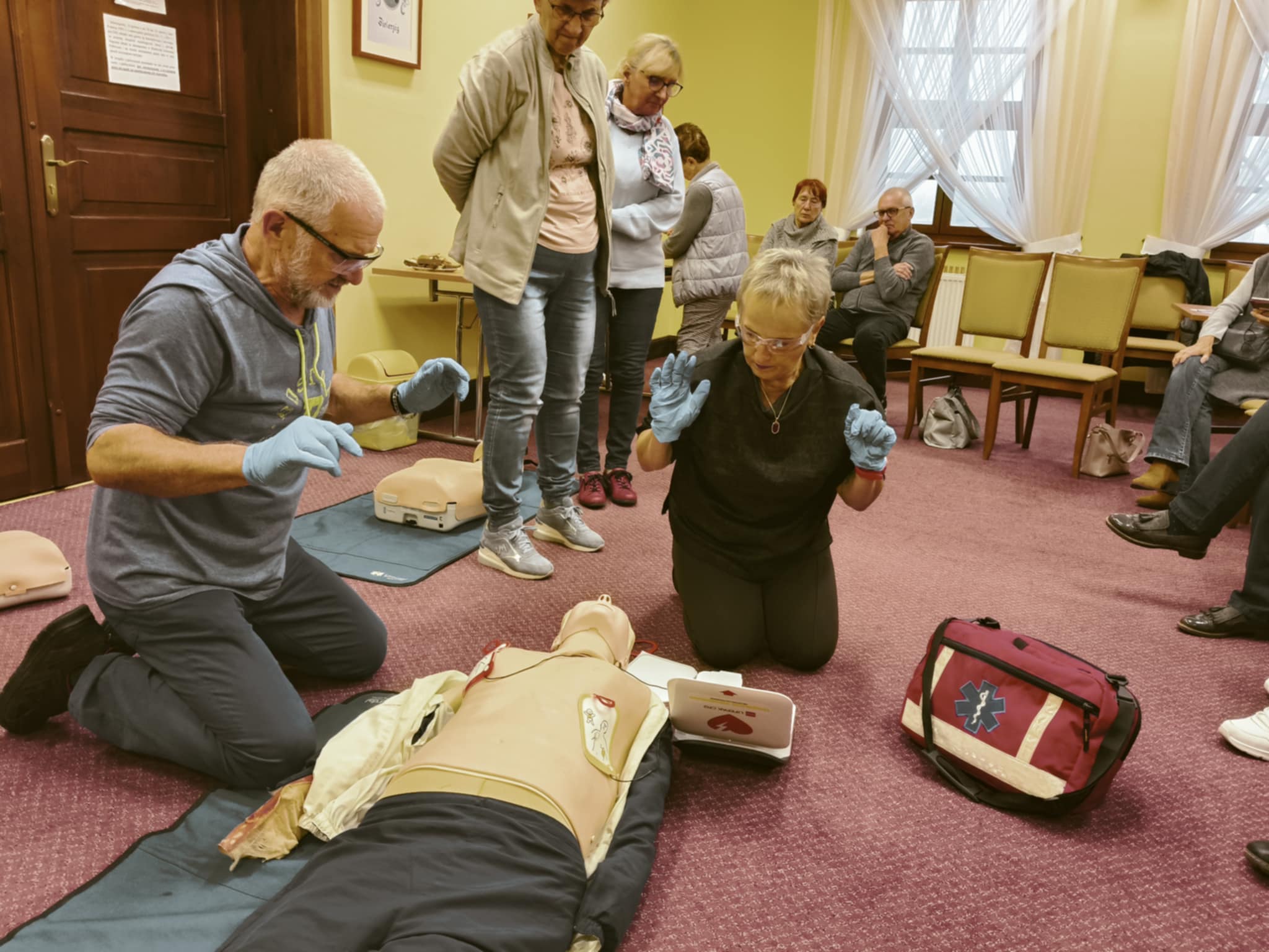 Seniorzy uczestniczą w warsztatach z pierwszej pomocy przedmedycznej. W ramach zajęć poznają praktyczne zasady udzielania pierwszej pomocy i postępowania w sytuacjach kryzysowych. Zajęcia mają charakter warsztatowy i wykorzystywane są w nich urządzenia ułatwiające przyswojenie tematu jak m.in. defibrylator i manekiny. Wiedza o tym, jak postępować w sytuacjach trudnych i nagłych jest ważna w każdym wieku. Seniorzy to wiedzą i dlatego chętnie biorą udział w organizowanych zajęciach.