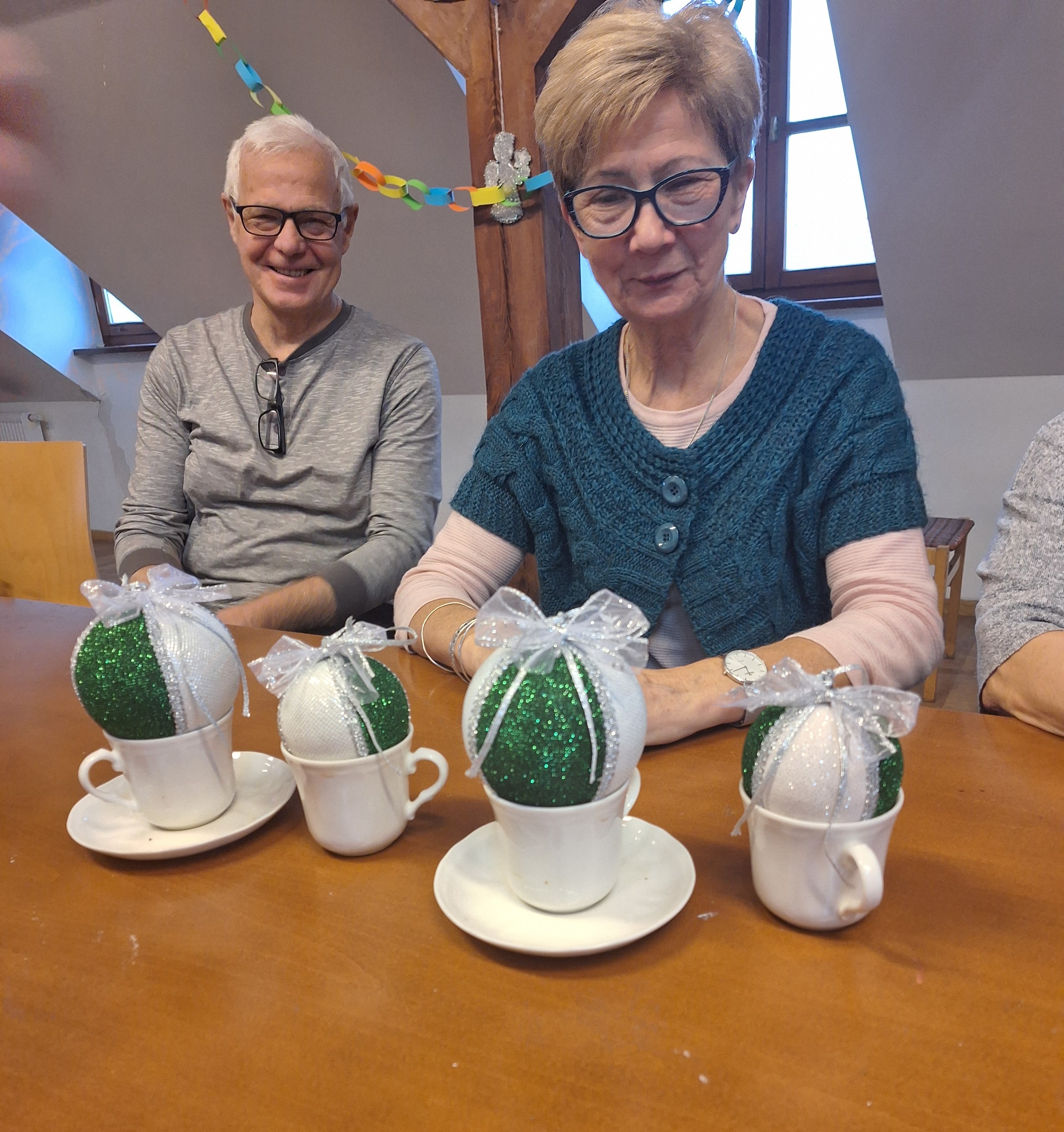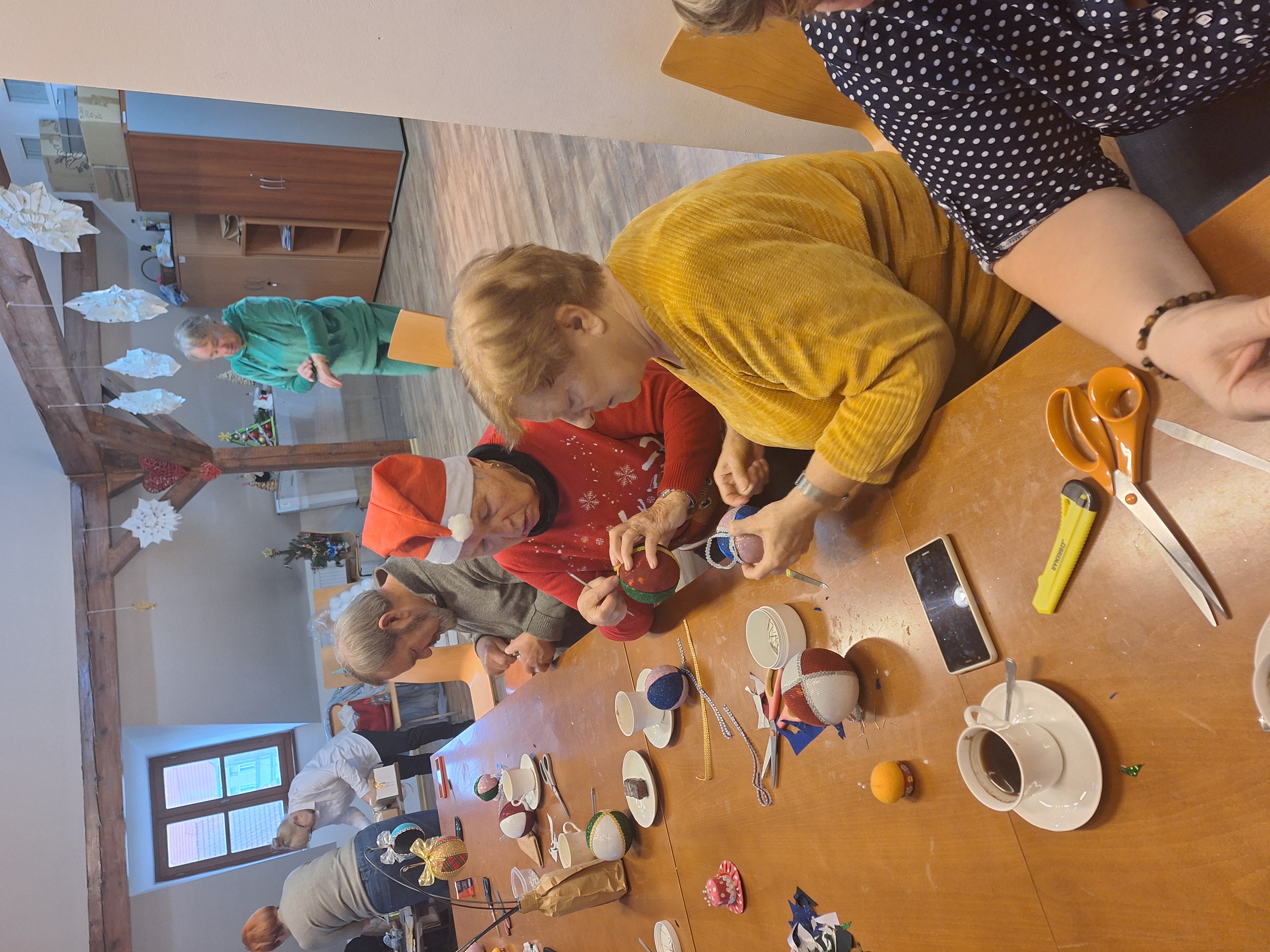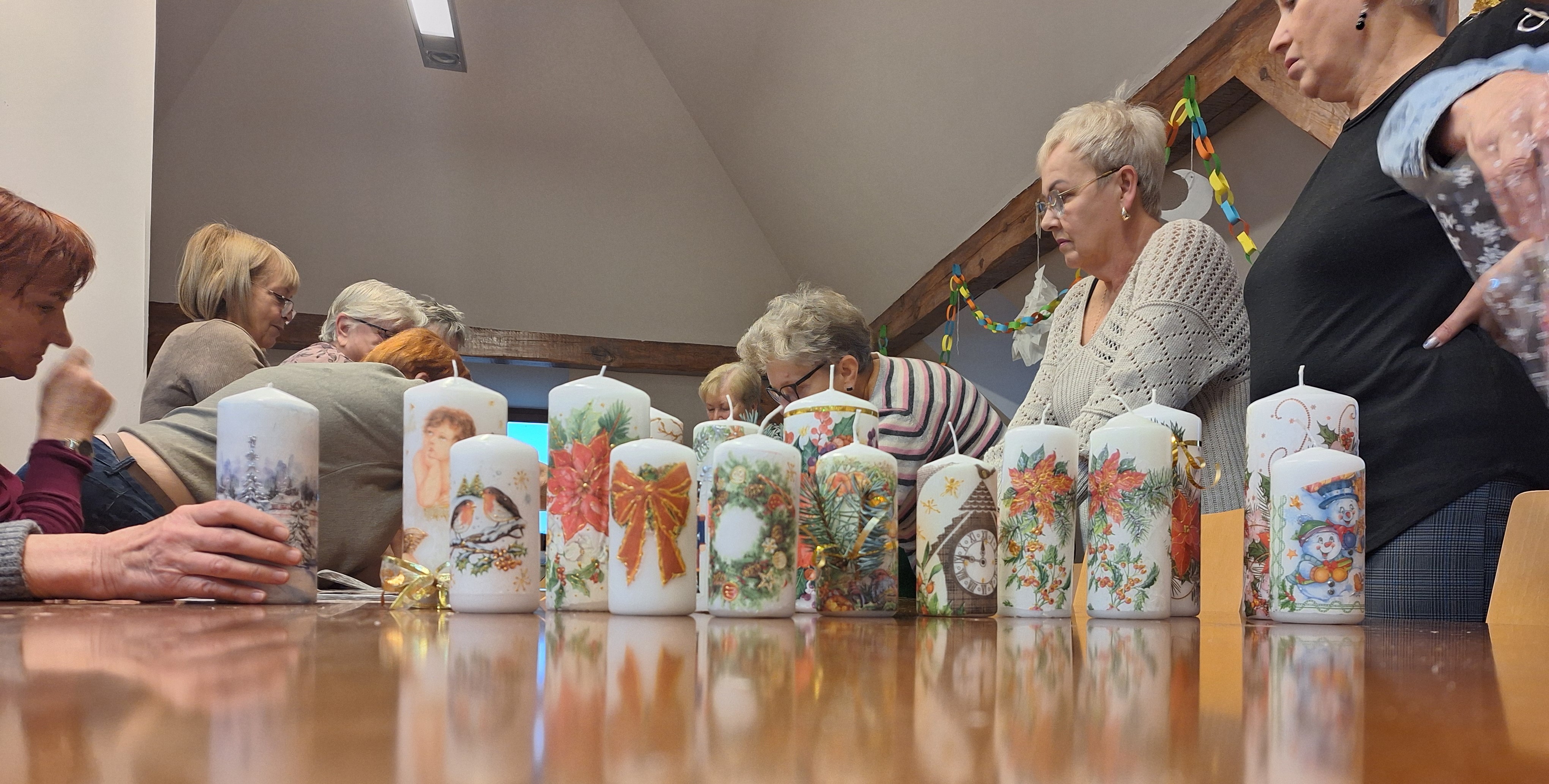 W dwóch pierwszych tygodniach grudnia seniorzy 60+ uczestniczyli także w zajęciach manualnych w ramach modułu kreatywnego - zorganizowano zajęcia manualne dla 6 grup. Uczestnicy wykonywali m.in. świąteczne bombki, świece techniką decoupage, drewniane choinki, świąteczne kartki malowane akwarelą a także obrazy metodą decoupage.