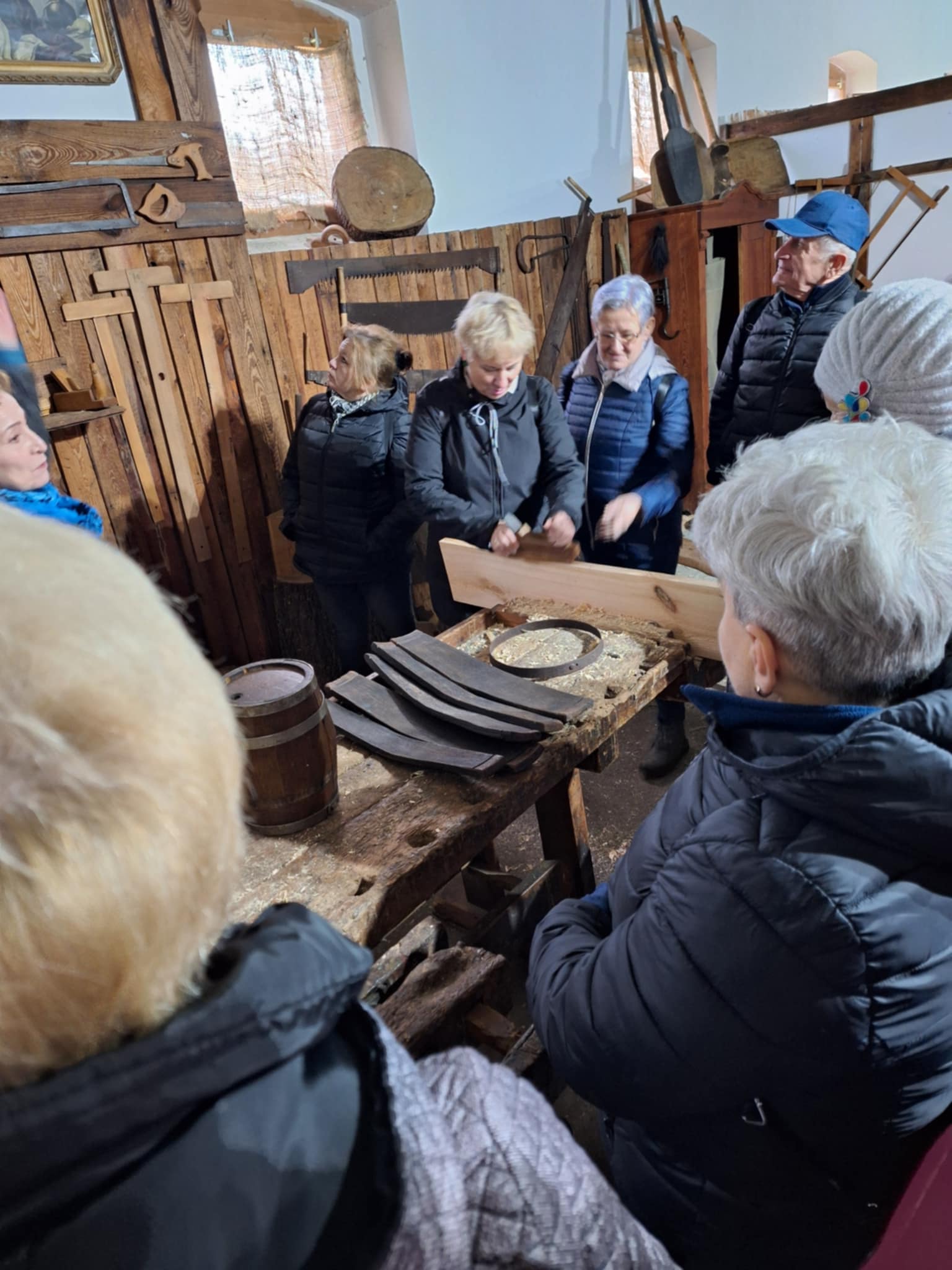 Jednym z kluczowych miejsc zaplanowanych do odwiedzin w ramach projektu, było Centrum Edukacji Regionalnej i Przyrodniczej w Mniszkach. Uczestnicy przeżyli niezwykle chwile, wracając pamięcią do czasów dzieciństwa. Podczas zwiedzania skansenu z przemiłą panią przewodnik, seniorzy mieli okazję zobaczyć urządzenia, narzędzia w warsztacie ginących zawodów: bednarza, kowala, szewca, praczki, pszczelarza oraz innych niezwykłych miejsc z przeszłości- izby szkolnej, sklepu kolonialnego i dawnej kuchni. Zwieńczeniem wycieczki były warsztaty stolarskie - uczestnicy pod okiem specjalisty, wykonali taboreciki, zwane ryczkami. Było sentymentalnie i momentami wzruszająco. Na zakończenie wycieczki, seniorzy skorzystali z posiłku (obiad). Zorganizowano dwa wyjazdy do skansenu dla łącznie 90 osób.